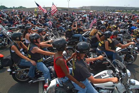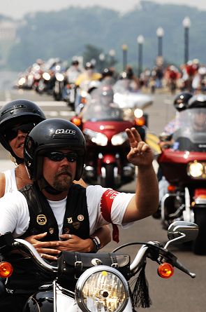 他們不論男女都穿著黑皮衣、牛仔褲,頭扎印花大頭巾,有的干脆穿軍服上陣。而他們昂貴的座騎也非常搶眼,個個體積龐大、引擎聲震耳欲聾,并裝飾著部隊徽章和美國星條旗。根據活動的路線,車隊穿過弗吉尼亞的紀念大橋,抵達華盛頓。在五角大樓前舉行集會后,他們又形成編隊,浩浩蕩蕩地駛過白宮附近的越戰老兵紀念碑。