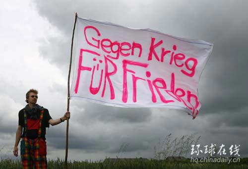 6月6日至8日,G8峰會將在德國海利根達姆召開。這次發達國家首腦峰會不僅吸引了全球媒體的關注,也引來了大批持不同意見的抗議者。圖為一名抗議者在羅斯托克機場高舉反戰標語。