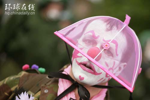 臉繪“彩妝”,身穿迷彩服的“小丑軍團”成員。