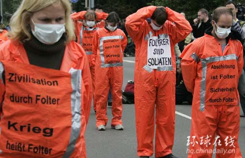 部分抗議者身穿“囚服”,抗議戰(zhàn)爭(zhēng)及虐囚行為。