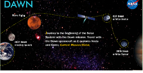 按照計劃,“黎明”號由Delta II號火箭搭載升空后,將于2009年2月在火星附近脫離火箭獨自前進。2011年至2012年,它將繞小行星帶的“灶神星”運行9個月左右,隨后將奔赴“谷神星”,從2015年開始圍繞它運行,整個太空旅行的距離達48億公里。