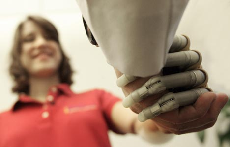 另據《蘇格蘭人報》報道,“觸摸仿生”公司開發的應用i-Limb系統的仿生手臂也已經問世。通過手術,患者斷臂殘端處的神經被連接到胸部肌肉群上,再由胸部的電極將肌肉傳送過來的電子脈沖信號發送給仿生手臂上的傳感器,以此支配其運動。手臂中安裝了鋰電池,一個晚上就能充滿電,外面則覆蓋著一層仿真皮膚。