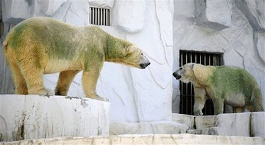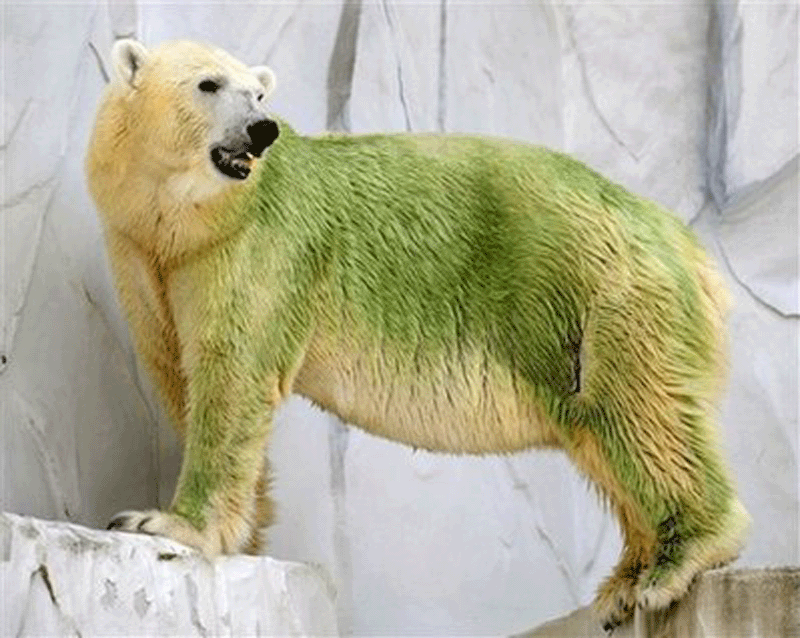 日本中部東山動植物園的3只普通北極熊今年7月份在一個海藻繁茂的池塘里游泳后,白色的絨毛竟然變成了綠色。這一情景使游客們甚是好奇,紛紛質疑這些熊是否生病了或是攜帶霉菌。