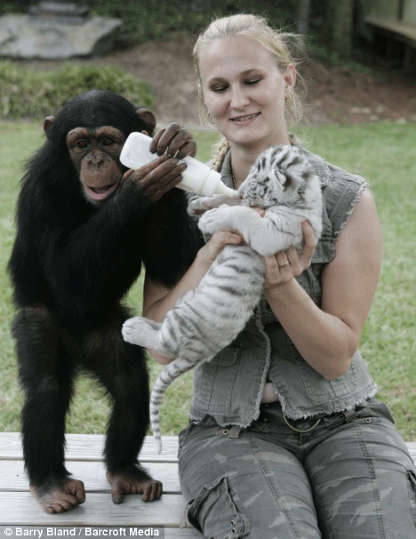 動(dòng)物協(xié)會(huì)創(chuàng)立者安特爾介紹說(shuō):“母猩猩安賈娜自出生以來(lái)一直與它的飼養(yǎng)員奇娜形影不離。它喜歡模仿奇娜的工作,還幫助奇娜照顧其他的動(dòng)物幼仔。”據(jù)了解,安賈娜已為豹子、獅子和猩猩擔(dān)任過(guò)保育員。它此前剛剛協(xié)助照料了4只小豹子,它們已經(jīng)變得親密無(wú)間。“它現(xiàn)在是白虎幼仔的‘養(yǎng)母’。它給它們奶瓶,并和它們躺在一起。它是一個(gè)非常出色的助手,”安特爾說(shuō)。