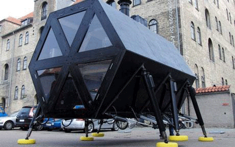 據英國《每日電訊報》10月21日報道,設計師已經制造出一間由6條“腿”支撐、可以跋涉于任何地形的房屋。它有10英尺(約3米)高,屋內有起居室、廚房、衛生間、木制火爐和一個控制這6條“腿”的大型計算機。這個屋子行走起來是靠太陽能和風能作為動力,每條“腿”都可以獨立行走,而且總是有三條“腿”著地以確保平衡。