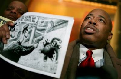 紐約州參議員亞當斯手持引發爭議的漫畫站在紐約郵報大樓前抗議