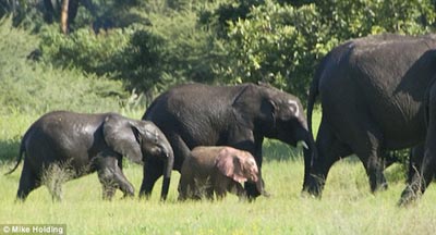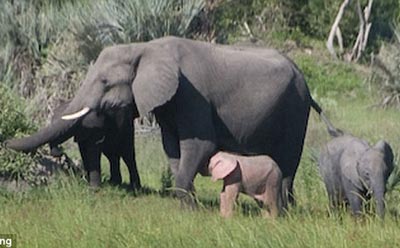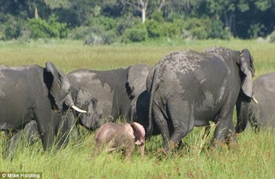 據英國《每日郵報》3月22日報道,霍爾丁當時正在為英國廣播公司(BBC)野生動物節目拍攝象群,突然一頭粉色的小象進入他的視線!攝制組工作人員最初還以為是幻覺,最后發現那真是一頭粉色的小象,它大約2至3個月大,粉色的皮膚使它在象群中分外顯眼。霍爾丁說:“當象群穿過河時我們看到了它,只有幾分鐘。這對所有營地里的人來說都是一個非常激動的時刻,我們知道這非常難得一見,大家都不敢相信自己的眼睛。”