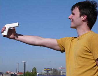 喂,這個帥哥要輕生么?看起來不像阿,怎么笑嘻嘻的……你以為他要自殺嗎?當然不是。其實他手里拿的是一款手槍形的數碼相機。