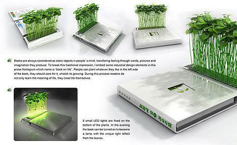 這款概念設計將綠色的氣息和書本很好的融合在了一起,在書本的的面加上一組小花盆,種上自己喜歡的植物,看書的同時,讓你充分領略大自然的氣息。“花盆”的底部還配有LED燈,這樣晚上看書的時候,植物就變成了臺燈。