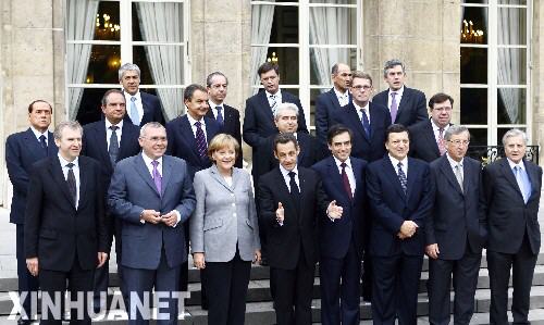 10月12日,在法國首都巴黎,歐盟輪值主席國法國總統薩科齊(前排左四)等歐元區領導人在峰會開始前合影。歐元區15國首腦12日在巴黎召開歐元區有史以來的首次峰會。會議通過了一項行動計劃,同意由各國政府為銀行再融資提供擔保并向銀行注資,以共同應對當前的金融危機。新華社記者張玉薇攝