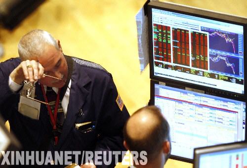 10月9日,一名交易員在美國紐約股票交易所工作時擦拭額頭。由于信貸市場依然緊縮和國際油價持續走低打壓金融和能源板塊,以及通用汽車股價跌至58年來新低,9日紐約股市再次暴跌,道瓊斯指數下跌超過650點,收于8600點以下,標普跌幅也超過7%。新華社/路透