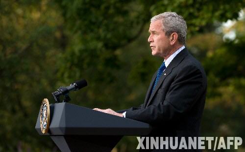 10月14日,美國總統布什在華盛頓白宮發表講話。布什當天表示將推出具體的救市措施,其中包括動用救援資金購買銀行股份。新華社/法新