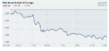道瓊斯工業(yè)股票平均價(jià)格指數(shù)跌381.99點(diǎn),至7888.88點(diǎn),跌幅4.62%,創(chuàng)去年11月20日以來的最低收盤水平,也創(chuàng)下12月1日以來的最大跌幅。標(biāo)準(zhǔn)普爾500指數(shù)跌42.73點(diǎn),至827.16點(diǎn),跌幅4.91%,創(chuàng)下2月2日以來的最低收盤點(diǎn)位。納斯達(dá)克綜合指數(shù)跌66.83點(diǎn),至1524.73點(diǎn),跌幅4.2%,創(chuàng)1月20日以來的最大跌幅。