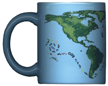 這個Global Warming Vanishing Coastlines Mug全球變暖中消蝕的海岸線之杯,本來杯身上的圖案展示的是現(xiàn)在地球陸地的模樣,而當(dāng)它裝滿了熱咖啡的時候,圖案就會慢慢變成兩極冰蓋融化海平面上升后的新的地球陸地輪廓圖。