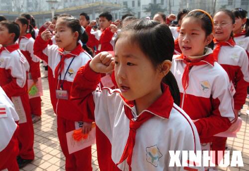 3月26日,少先隊員在宣讀踐行“八榮八恥”的誓言。當日,江蘇省暨南京市青少年社會主義榮辱觀主題教育活動啟動儀式在南京舉行。江蘇各級共青團組織將廣泛開展“知榮辱,樹新風”、“我與祖國共奮進”等主題教育活動。 新華社記者楊磊攝