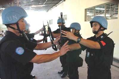 2006年2月4日,中國維和警官王雷和田雷(左)在太子港海地大選計票中心執勤。自當日起,我維和防暴警察開始進入海地大選計票中心執勤。聯合國海地穩定特派團警察總監格雷厄姆4日證實,中國維和警察防暴隊將在7日舉行的海地總統、議會和地方選舉中承擔全國計票中心的保衛任務。