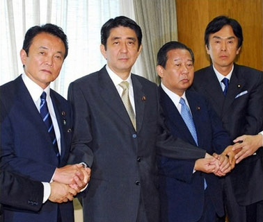 8月27日,日本首相、自民黨總裁安倍晉三(左二)與自民黨新領導層部分成員在一起:干事長麻生太郎(左一)、總務會長二階俊博(右二)和政調會長石原伸晃。
