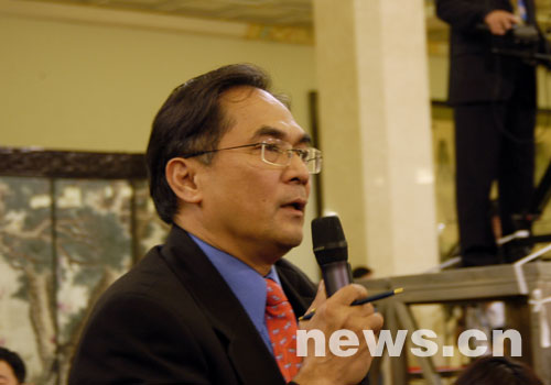 十七大首場記者招待會于2007年10月16日(星期二)15:00舉行,教育部部長周濟(jì)和科技部副部長李學(xué)勇介紹中國科技教育發(fā)展情況,并回答記者提問。圖為美國國際市場新聞社記者提問。(人民網(wǎng)記者何萌 孫少遜攝)