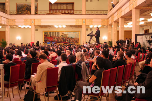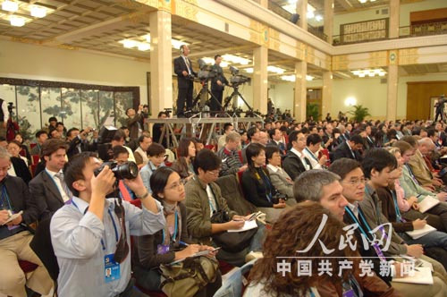 10月14日16:30,中國共產(chǎn)黨第十七次全國代表大會新聞發(fā)言人李東生在人民大會堂三樓金色大廳舉行首場新聞發(fā)布會。圖為發(fā)布會現(xiàn)場。(新華網(wǎng)蔡國華/攝)