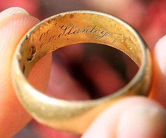 最初,布蘭迪以為這是船上的一個零件,但當他拿近細看時卻發現,這是一枚戒指,而且內側刻著一行字:“給斯坦利,費洛倫絲 ,1916年3月。”布蘭迪意識到,這可能是海難中喪生的某個人的遺物。“這可是令人驚奇的時刻,我的脖子后面的汗毛都豎起來了,”他說。