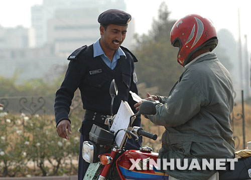 11月29日,在巴基斯坦首都伊斯蘭堡的總統府附近,警察檢查一名騎摩托車者的證件。當天,剛剛辭去陸軍參謀長職務的穆沙拉夫在總統府以平民身份宣誓就任新一屆巴基斯坦總統。新華社記者李敬臣攝