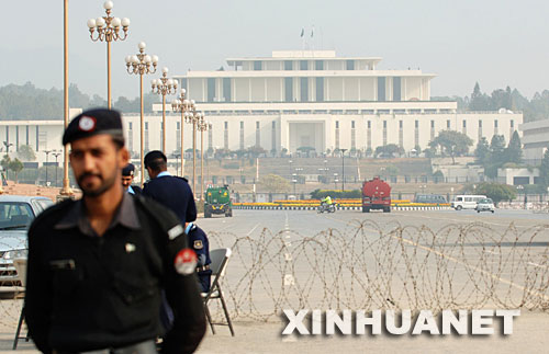 11月29日,在巴基斯坦首都伊斯蘭堡,巴安全人員封鎖通往總統府的道路。當天,剛剛辭去陸軍參謀長職務的穆沙拉夫在總統府以平民身份宣誓就任新一屆巴基斯坦總統。新華社記者李敬臣攝