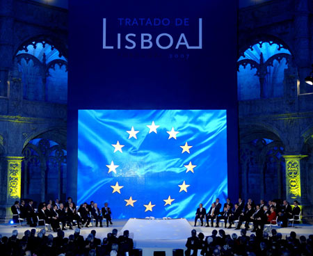 12月13日,在葡萄牙首都里斯本,歐盟各成員國領導人依次上臺簽署《里斯本條約》。