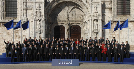12月13日,在葡萄牙首都里斯本,歐盟各成員國領導人在《里斯本條約》簽署后合影留念。(圖片來源:新華社)