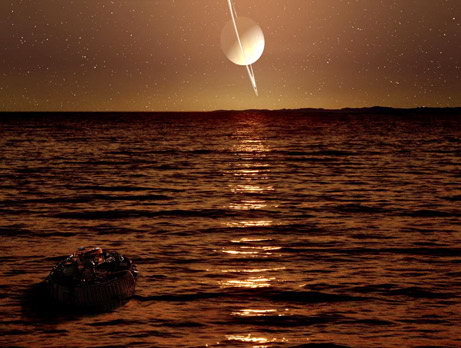 藝術家所繪制的想像圖,NASA與歐洲宇航局共同研發的“惠更斯”號探測器在土星的最大衛星土衛六上的甲烷湖上漂浮著。