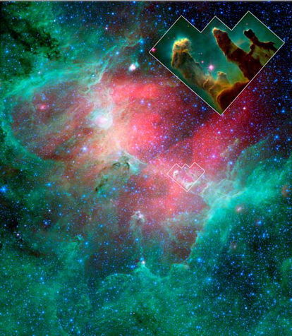 從NASA公布的這樣斯匹哲太空望遠鏡拍攝的照片來看,天鷹座星云的綠色背景中心正出現一大片被超新星爆炸灼燒地發紅的區域,“創造之柱”正在超新星沖擊波的路徑上。