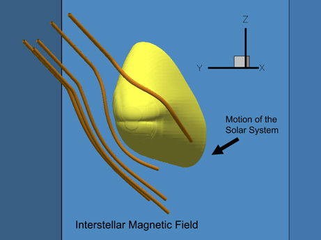 圖片展示了被帶電粒子(黃色)包裹的太陽系在穿越銀河系的星際磁場(棕色線)時的形狀。5月11日出版的《科學》雜志利用美國“旅行者”號探測器提供的數據推測,太陽系在太空穿梭時像是一顆子彈。