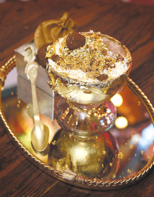 這款冰激凌由來自14個國家的28種世界稀有可可粉、昂貴的奶油和5克可食用金粉制成,盛放在底部鑲有1克拉白鉆和18K黃金飾環的金邊高腳杯里。店主斯蒂芬·布魯斯說:“原料都是從世界各地空運而來的,這就是這款甜點的特別之處。”據介紹,顧客在品嘗完這款萬元甜點后,可以把金邊高腳杯和金勺子帶回家。 (李卉)