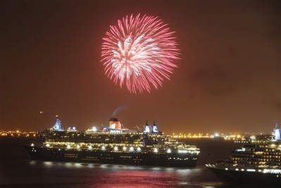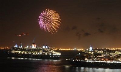 據美國媒體報道,三艘豪華郵輪在自由女神像前一線排開。此時,璀璨的煙花點亮了冬季的夜空,更給這個難忘的時刻增添了幾分色彩。