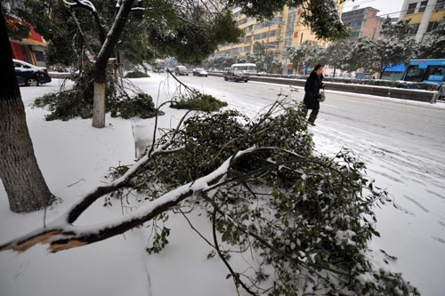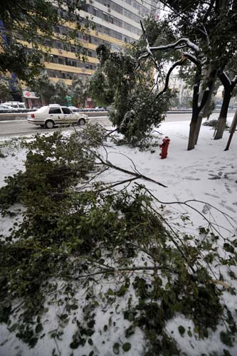 1月29日,南昌市陽明路兩旁的樟樹樹枝被大雪折斷。 12月28日晚,南昌市普降大雪,這是入冬以來最大的一場雪。據(jù)悉,1月中旬以來,南昌市持續(xù)了10多天雨雪、低溫天氣,創(chuàng)50年之最。