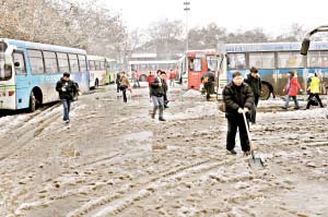 昨日,記者在宿州街頭看到,由于路面積雪融化,許多賣年貨的小攤出現(xiàn)在街頭。一名正在搶購年貨的陳阿姨說,“聽說過兩天還有暴風(fēng)雪,只能趁這個機會將年貨買齊,等暴風(fēng)雪來到的時候就不用出門了”。
