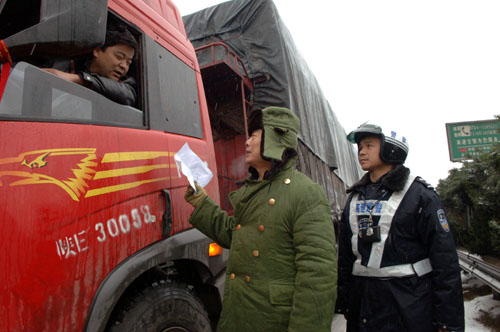 2月1日,湖南省委常委、常務副省長,省抗冰救災指揮部總指揮于來山(中)在京珠高速公路上為司機發放行路指南。他在高速公路上已經連續工作了7天7夜。面對冰雪災害,湖南省的黨員干部發揮先鋒模范帶頭作用,經受寒風冰凍考驗,積極奮戰在抗擊冰雪第一線。