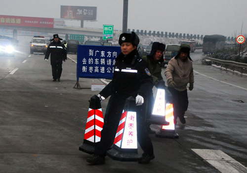 2月1日,湖南省交警總隊副總隊長、高速公路管理支隊支隊長楊能(前)在疏導車輛分流。他在高速公路上已經連續工作了19天。面對冰雪災害,湖南省的黨員干部發揮先鋒模范帶頭作用,經受寒風冰凍考驗,積極奮戰在抗擊冰雪第一線。