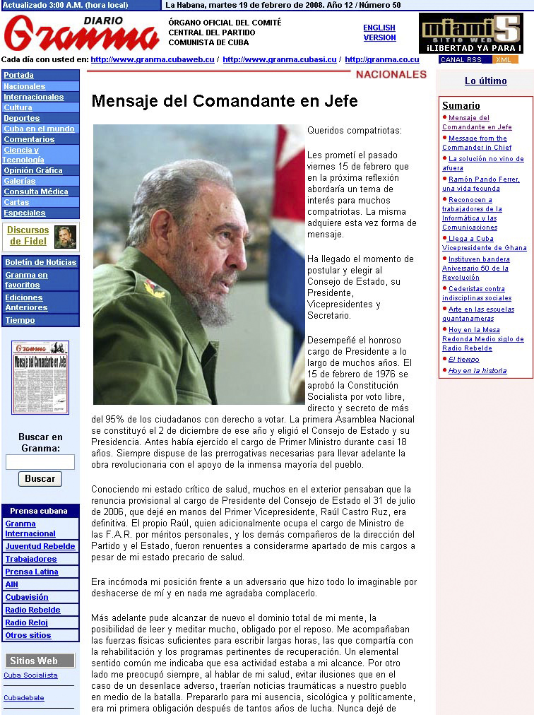 卡斯特羅在古共中央機關(guān)報《格拉瑪報》網(wǎng)站上發(fā)表聲明