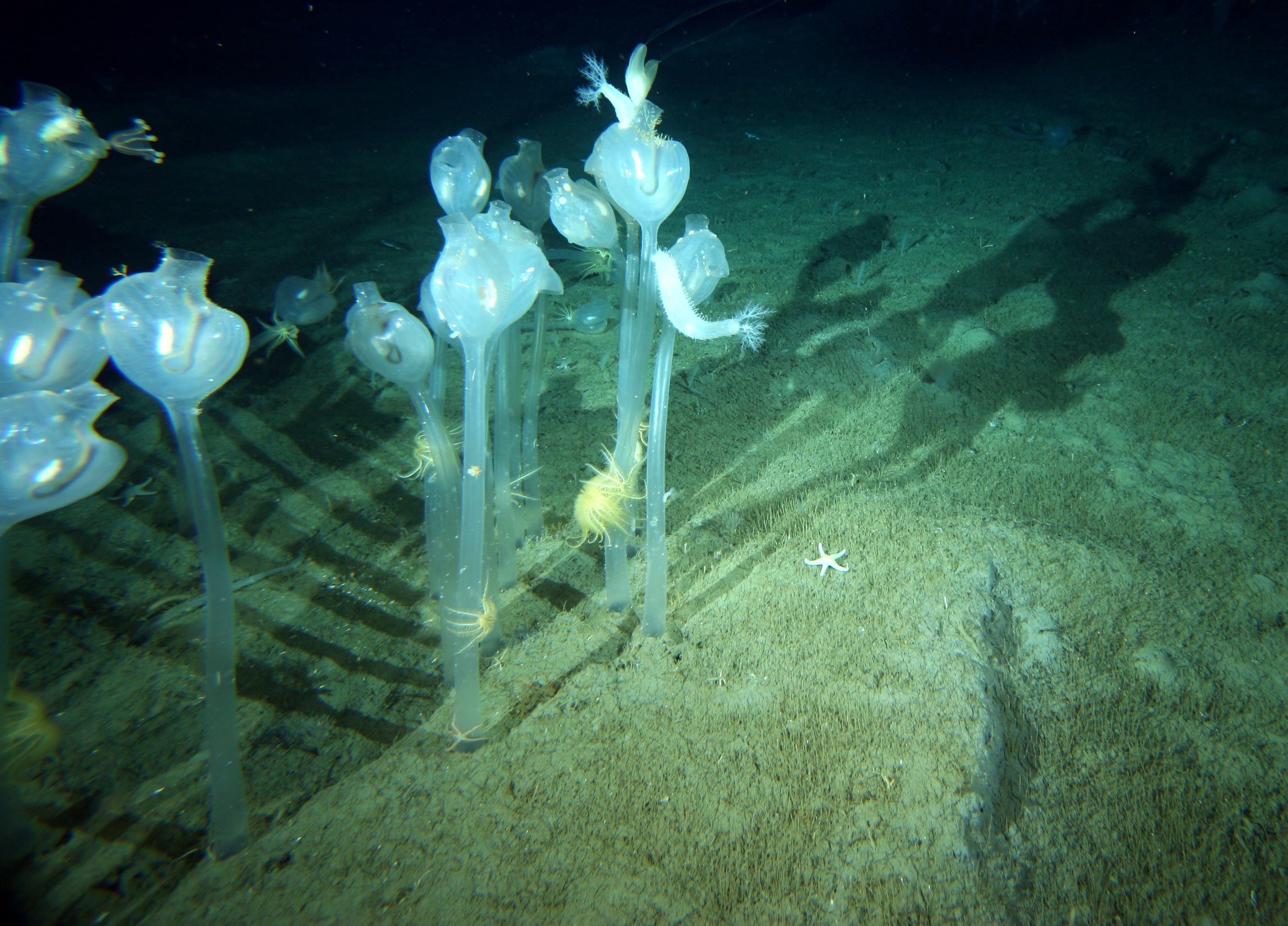 里德爾說,還有一些很奇特的生物,比如一種有囊的生物,它以浮游生物為食,身體結構像脆弱的玻璃,近1米高,在海床上站立的樣子就像罌粟花,又像玻璃做的郁金香。還有一些魚類的鰭和嘴部都很奇特:長鰭的部位全身都有可能,嘴部周圍長著一些可搖擺晃動的部分,看上去很滑稽。里德爾還介紹說,一些魚類都長有非常大的眼睛,因為這些海底“居民”只有以不同的方式進化成如此模樣才能在黑暗的海底生存下來。