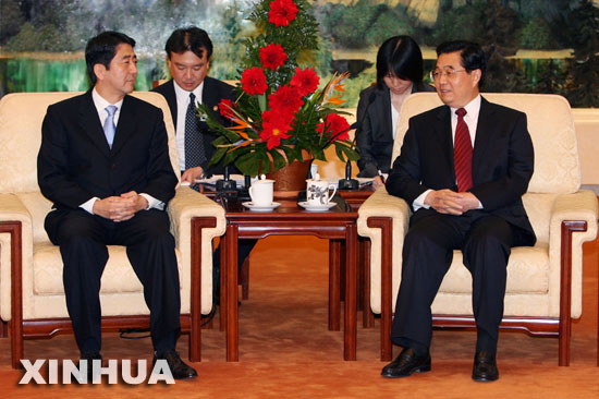 國家主席胡錦濤8日下午在人民大會堂會見了日本首相安倍晉三。