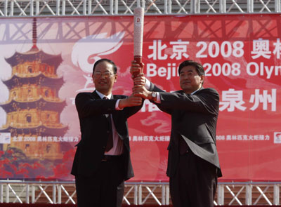 泉州市委書記徐剛從奧組委火炬接力中心副主任劉寶杰手中接過圣火。[攝影:胡美東]