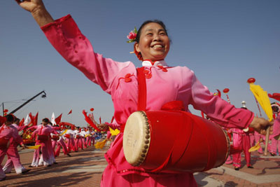 泉州群石村村民揚秀紅熱舞迎圣火。[攝影:胡美東]