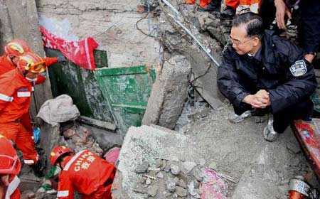 中國日報網環球在線消息:在被掩埋的小學廢墟旁,溫總理用嘶啞、哽咽的話語,向廢墟中的孩子喊話。一位在現場的記者通過QQ發出即時報道稱:“年過花甲的總理已經哭得不成樣子了。”