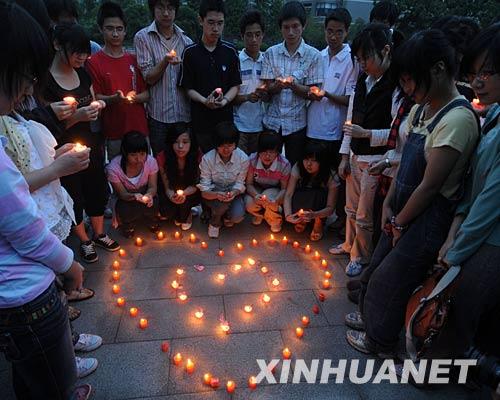 5月14日,學生們手持蠟燭為四川地震災區祈禱。 新華社記者徐昱攝