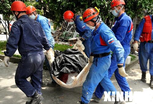 5月18日,俄羅斯救援隊(duì)隊(duì)員將剛剛?cè)〕龅挠鲭y者遺體抬出廢墟。當(dāng)日,俄羅斯救援隊(duì)員在都江堰一建筑廢墟中發(fā)現(xiàn)一名遇難者。這名遇難者保持著站立的姿勢,四周被各種物品死死塞住。為了不傷到遺體,救援隊(duì)員放慢速度,精心工作,在比原計(jì)劃推遲了兩個(gè)多小時(shí)后,終于將遇難者遺體取出。新華社記者陳燮攝