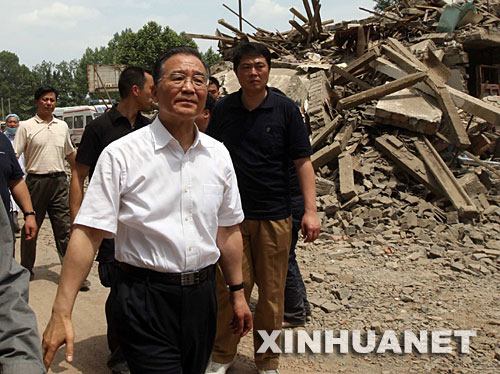 5月15日,中共中央政治局常委、國務院總理溫家寶輾轉趕到位于四川北部的青川縣木魚鎮看望受災群眾。這是溫家寶在木魚鎮文武村的臨時安置點看望災民。新華社記者姚大偉 攝