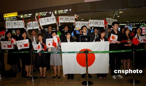 5月21日上午,數十位在日華人華僑自發來到成田機場,歡迎從四川地震災區歸來的日本國際緊急救援隊。他們手持中日兩國國旗和書有“中國人感謝日本”、“救援隊的諸位辛苦了”的橫幅,向支援中國抗震救災的救援隊隊員表示感謝。中新社發 朱沿華 攝