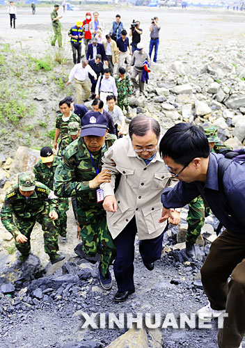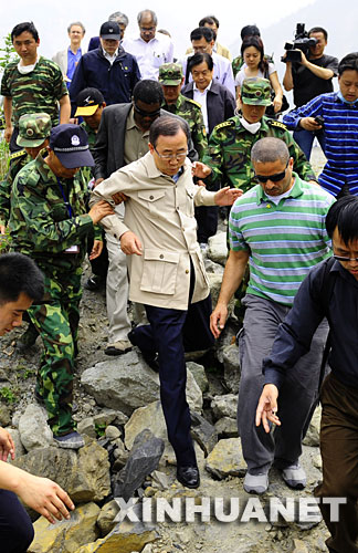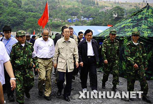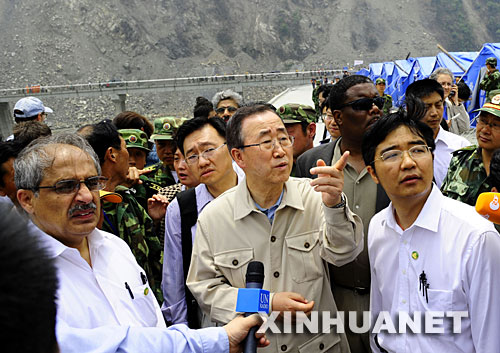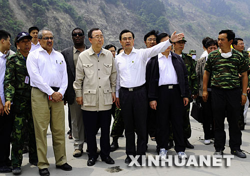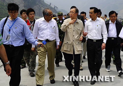 5月24日,聯合國秘書長潘基文來到中國地震重災區(qū)四川省汶川縣映秀鎮(zhèn)察看災情。 新華社記者 任勇 攝