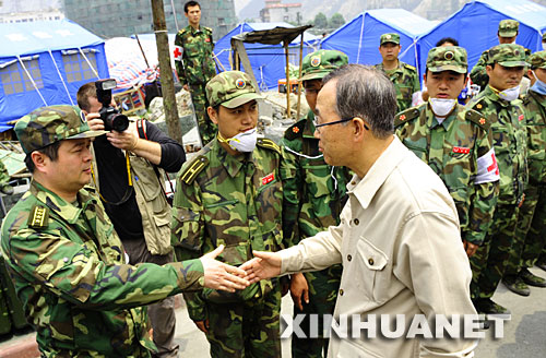 5月24日,聯合國秘書長潘基文來到中國地震重災區(qū)四川省汶川縣映秀鎮(zhèn)察看災情。這是潘基文與執(zhí)行衛(wèi)生防疫任務的北京軍區(qū)某醫(yī)院醫(yī)生握手。新華社記者 任勇 攝