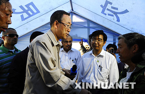 5月24日,聯合國秘書長潘基文來到中國地震重災區(qū)四川省汶川縣映秀鎮(zhèn)察看災情。這是潘基文在四川映秀鎮(zhèn)看望災民。 新華社記者任勇 攝